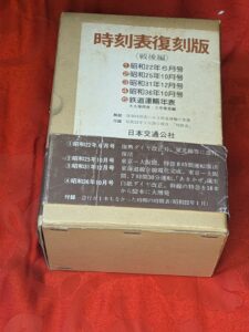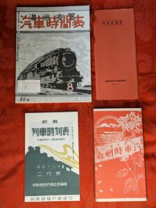 今日は、昔の鉄道時刻表の復刻版や、海外の鉄道時刻表を紹介していきたいと思います。まずは、昔の鉄道時刻表の復刻版からとりあげます。例えば、戦前の鉄道時刻表とか1950~70年代の時刻表などは、その当時の現物も古書市場には出ていますが、それとは別にその当時のものを写真製版等して復刻版を出すこともあります。復刻版とかは比較的手に入りやすいです。例えば、昭和20年代から30年代の復刻版セット(下記写真左)とか、戦前の朝鮮、満洲、台湾の時刻表、明治時代の時刻表の復刻版(下記写真右)などがあります。これらを見ると、東京-下関-釜山-奉天-新京行きの列車の時刻とか、明治44年9月の山陽本線の時刻:最寄り駅の山陽本線有年駅に上り7本、下り7本停車するとかがわかります。