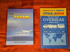 そのほか、海外の鉄道時刻表ですが、有名どころでは、トーマスクック鉄道時刻表(赤版:ヨーロッパ、青版;その他地域の主要列車)があります。トーマスクックがもう紙ベースの時刻表を出さなくなりましたが、赤版のヨーロッパ鉄道時刻表は他社が受け継いで紙ベースで出版されているようです。青版については、紙ベースでは廃止されたようです。日本ではダイヤモンド社が昔、日本版青版(写真参照)として発行していました(現在は廃止)。他に紙ベースの海外の鉄道時刻表は、アメリカ、韓国、台湾、中国、インドなどありますが、日本でも中国専門書店で手に入った中国鉄路時刻表(写真参照)は、現在、中国鉄道出版社版の紙ベースは廃止となり、電子版(ネットで見る)ものしかありません。ただ、日本国内で有志が情報を集め、翻訳、作成している「中国鉄道時刻表」や、「韓国シティ時刻表」、「中国シティ時刻表」、台湾時刻表などは流通しています。当店では「韓国シティ時刻表」、「中国シティ時刻表」についてはBaseにて新刊を取り扱いしています(写真参照)。