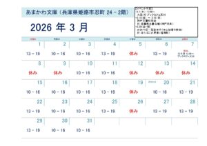 3月の芸備書房姫路支所(あまかわ文庫姫路駅前店)の営業日ですが、毎週木曜日はお休み、水、金、土、日曜は13-19時、月、火曜日は10-16時まで営業いたします(ただし、11、15、20日は10-16時になります)。