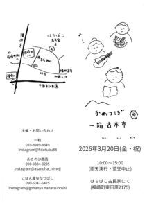 その他催事は、3月13-15日神戸古書即売会(at兵庫県古書会館:JR元町、神戸高速花隈駅 10-18時)、20日金曜日はかめつぼ一箱古本市(兵庫県神崎郡福崎町、はちばこ古民家 10-15時)に出店いたします。