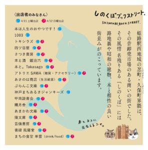 また、4月11-12日11-16時に開催される「しのくぼブックストリート」(兵庫県姫路市忍町24 当店姫路支所1階シェアキッチンあわあわ)にも出店いたします。