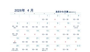4月の芸備書房姫路支所(あまかわ文庫姫路駅前店)の営業日ですが、毎週木曜日はお休み、水、金、土曜は13-19時、日、月、火曜日は10-16時まで営業いたします(ただし、11日は11-17時、12日は10-16時になります)。