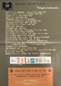 2025.3.20(木祝)ふくやまブックマルシェは体調不良で不参加です。 2025.03.19 NEWS 関係者、お客様には大変ご迷惑をおかけいたしますが、何卒ご容赦ください。 関連情報 2025.3.20(木祝)ふくやまブックマルシェ… コメントは受け付けていません。